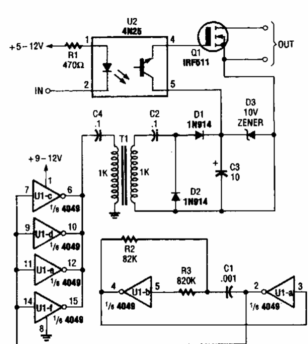 Esta interessante configuração de disparo óptico usando um oscilador foi encontrada numa Popular Electronics dos anos 90. Detalhes do transformador não foram dados.