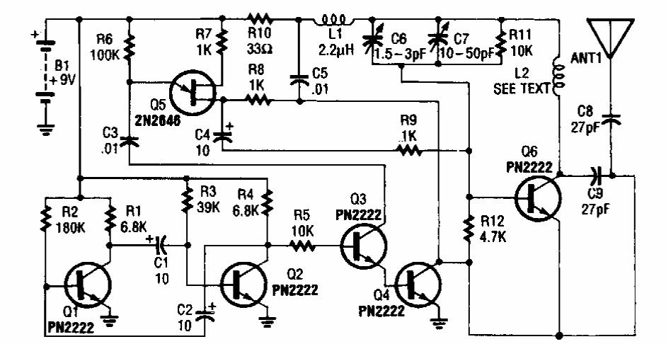 Este circuito foi encontrado num Electronics Hobbyst Handbook de 1993. O circuito opera na faixa de FM. A bobina tem 4 espiras de fio 24 ou 26 em forma de 0,5 cm.