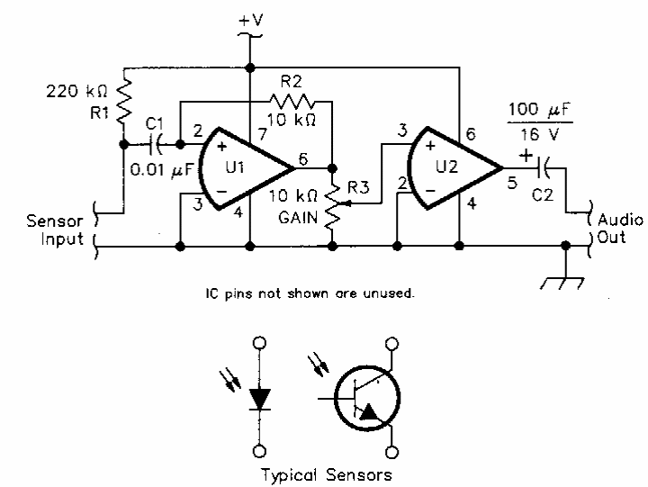 Este circuito para um link óptico de áudio usando LED ou LASER foi encontrado numa revista QST dos anos 90. O circuito pode usar amplificadores operacionais como o 741.