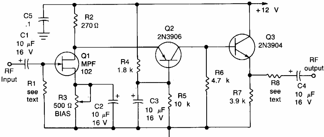 Este circuito responde a frequências de 100 Hz a 3 MHz. Encontramos numa Radio Electronics dos anos 90. Os transistores são de uso geral.