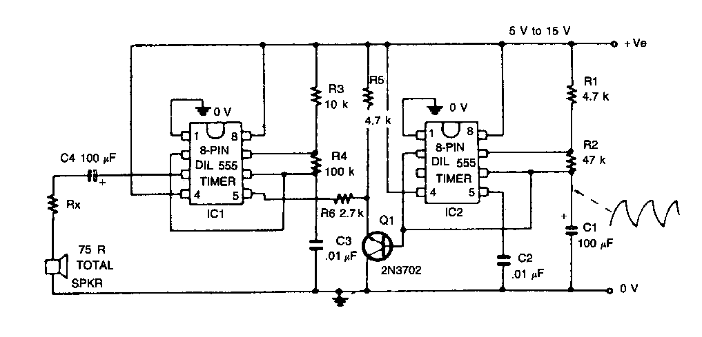 Este circuito simula uma sirene americana, podendo ser encontrado em outros pontos deste site e seção. O circuito é de uma documentação dos anos 90. Preferivelmente, o sinal deve ser aplicado a um amplificador.