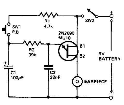 Encontrado numa documentação inglesa dos anos 90, esta sirene crescente e decrescente, acionada manualmente aciona um fone de baixa impedância. O UJT pode ser o 2N2646.