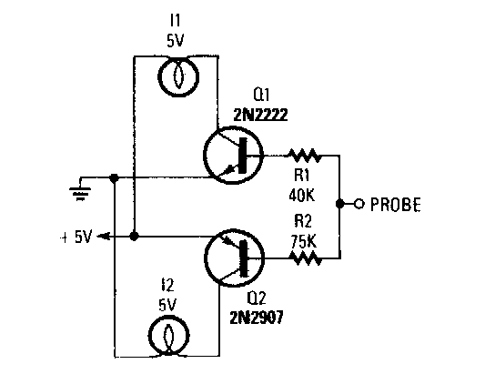 Usando transistores e lâmpadas, este circuito simples foi encontrado numa Popular Electronics. O circuito pode usar LEDs e é alimentado pela tensão da lógica em análise (TTL).