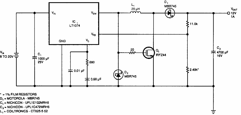 Encontrado numa EDN dos anos 90, este regulador faz uso de circuito integrado da época. A entrada pode ser de 8 a 20 V.