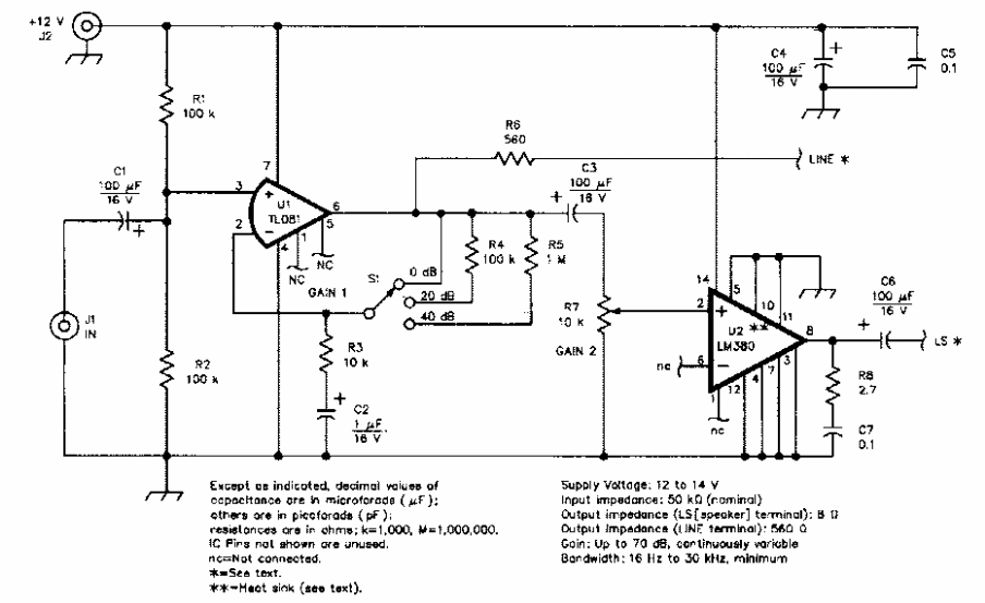 Este circuito foi obtido numa revista QST dos anos 90. O circuito faz uso de componentes pouco comuns em nossos dias. O circuito inclui uma chave seletora de ganhos.
