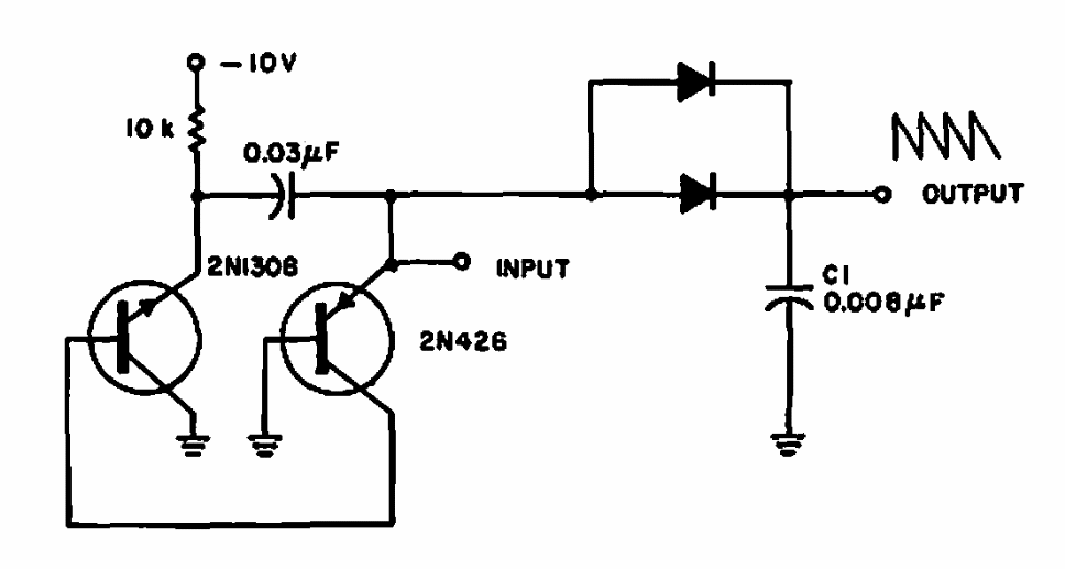 Este circuito pode erar sinais de 80 a 800 Hz com amplitude de 0,3 V. Encontramos numa Electronic Design de 1967. Os diodos são de uso geral e com frequências mais baixas a amplitude do sinal é maior.