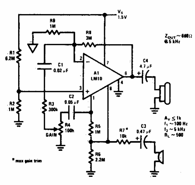 Este amplificador para microfone opera com a tensão de uma pilha. A saída é em fone de ouvido. O circuito integrado usado é pouco comum atualmente.