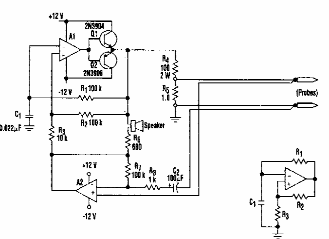 Encontrado numa Electronic Design dos anos 90, este sofisticado provador de continuidade utiliza amplificadores operacionais da época.