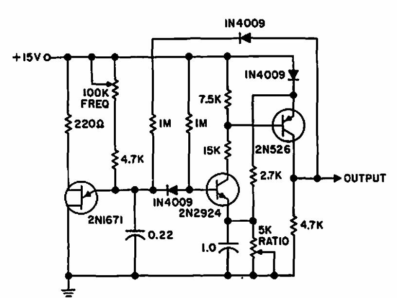 Com controle de frequência e ciclo ativo, este circuito foi encontrado em documentação da General Electric dos anos 60. O circuito admite componentes equivalentes.