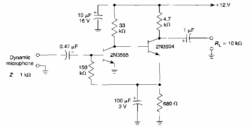 Encontramos este preamplificador com ganho de 70 dB para microfones em documentação americana dos anos 90. O consumo é baixo e transistores equivalentes podem ser usados.
