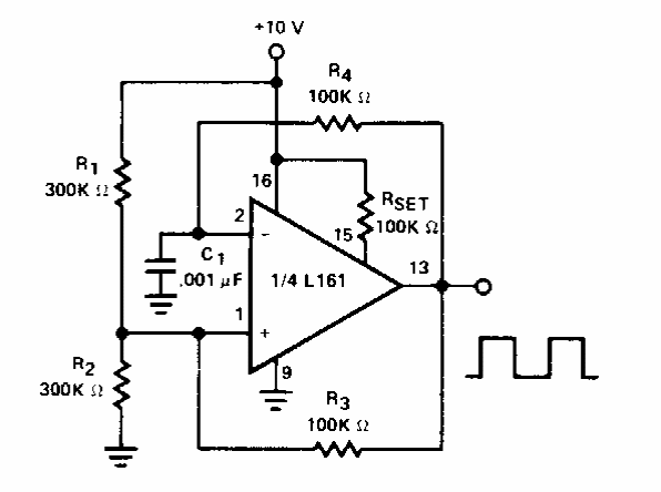 Gerando um sinal quadrado (50% de ciclo ativo), este circuito foi encontrado em documentação da Siliconix dos anos 80. O circuito pode ser aplicado a outros operacionais.