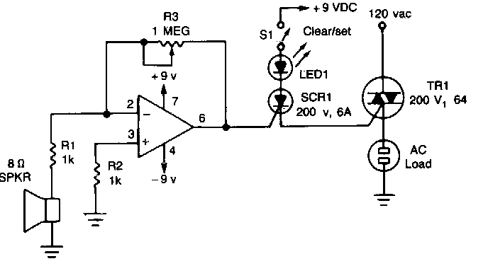 Este circuito é de uma Radio Electronics dos anos 80. Ele aciona uma carga alimentada pela rede de energia a partir do sinal de áudio captado pelo microfone.