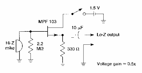 Encontrado com variações neste site, este circuito foi retirado de uma documentação americana dos anos 90. Ele se destina a microfones de alta impedância.