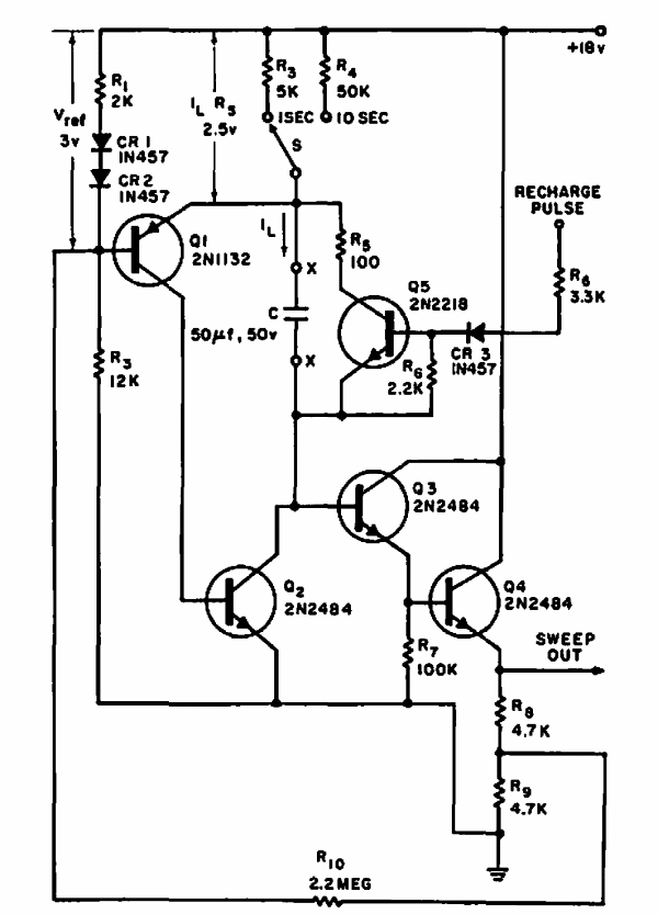 Este circuito linear foi encontrado numa Electronic Design de 1965. Os transistores são da época. Podem ser usados transistores equivalentes modernos. A faixa de sinais vai de 1 a 10 segundos.