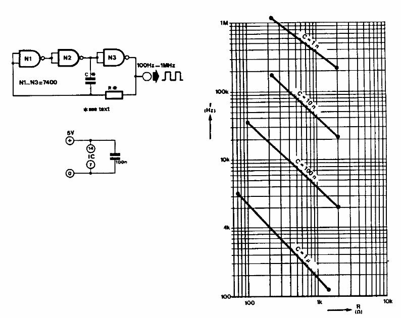 Na figura temos um oscilador básico com inversores obtidos de portas TTL, CMOS ou outras. O gráfico ao lado permite encontrar a frequência em função do resistor e do capacitor.