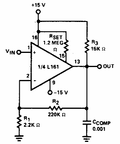 Este circuito é de uma documentação antiga. O operacional usado é pouco comum em nossos dias. O circuito possui um ganho x faixa passante de 20 MHz.