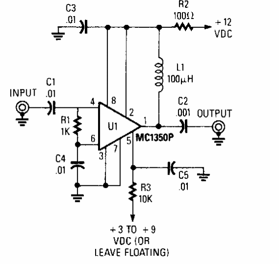 Encontrado numa Popular Electronics antiga, este circuito tem um ganho de 20 dB. O circuito integrado usado é pouco comum em nossos dias.