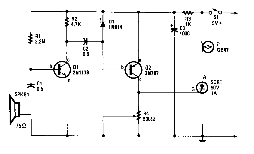 Este circuito foi encontrado numa Hands On Electronics dos anos 90. O microfone é um pequeno alto-falante de 75 ohms. Pode ser usado um de menor impedância com um transformador.