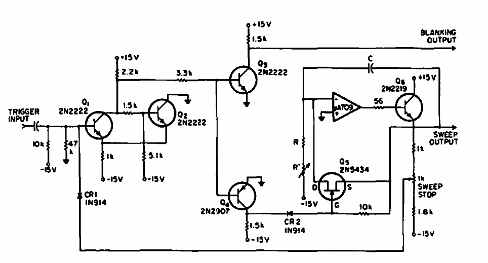 Encontrado em documentação de 969, este circuito gera sinais de varredura de 1 Hz a 100 kHz. Os componentes usados são da época, podendo ser utilizados equivalentes.