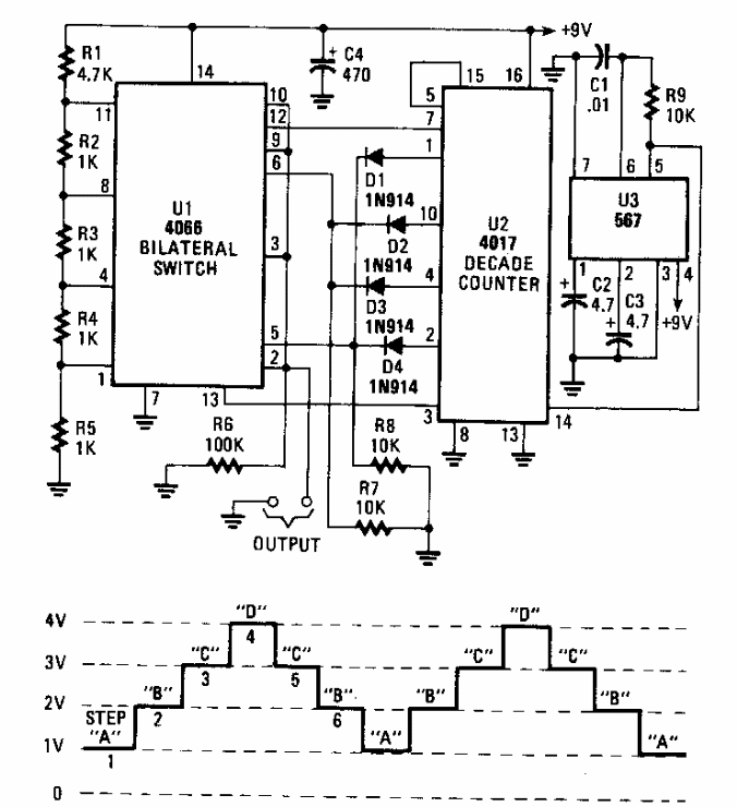 Este circuito foi encontrado numa Popular Electronics dos anos 90. O circuito usa componentes comuns atualmente. A forma de onda do sinal gerado é mostrada junto ao diagrama.