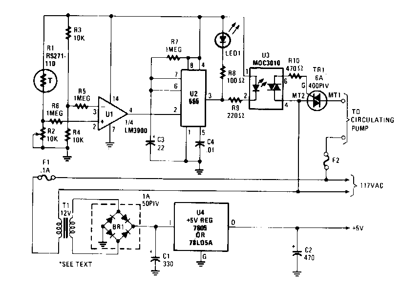 Este circuito foi encontrado numa Popular Electronics dos anos 90. Ele se baseia em componentes ainda comuns em nossos dias e num acoplador óptico para o triac. O sensor é um termistor.
