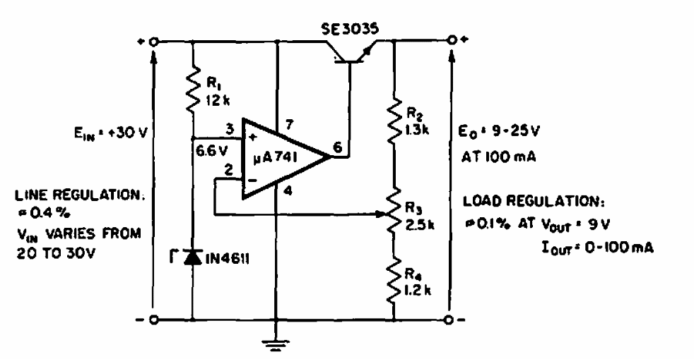 Este pequeno regulador de tensão foi encontrado numa EEE de 1969. Podem ser usados transistores mais potentes para se obter uma corrente maior de saída.
