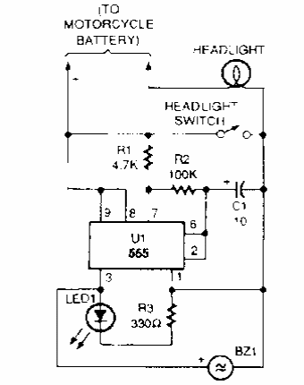 Este circuito avisa quando a lâmpada do farol está acionada. Encontramos numa Popular Electronics dos anos 80. O circuito emprega um buzzer de 12 V com oscilador.
