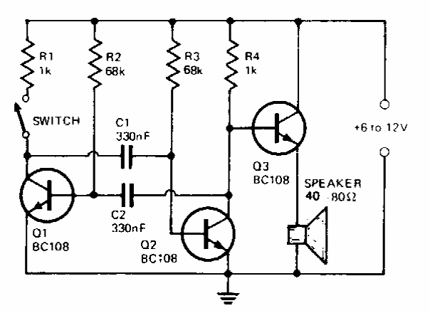 Encontrada numa documentação inglesa dos anos 80, esta sirene simples com 3 transistores alimenta diretamente um pequeno alto-falante. O circuito gera um sinal de 300 Hz aproximadamente.