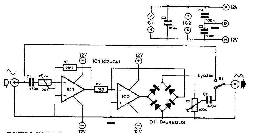 Este circuito dobra a frequência de um sinal de áudio, mudando assim seu timbre. O circuito foi encontrado numa Elektor dos anos 90. Os componentes são comuns em nossos dias.