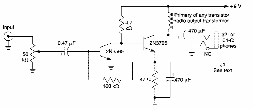 Este circuito simples para fones ou pequenos alto-falantes foi encontrado numa documentação dos anos 90. O circuito funciona com tensões de 5 a 9 V e tem bom ganho.