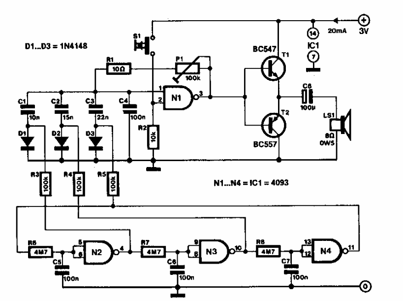 Encontrado numa Elektor dos anos 90, este circuito se baseia em componentes ainda comuns em nossos dias. A alimentação é feita com apenas duas pilhas.
