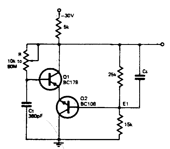 Este simples oscilador com dois transistores de uso geral tem sua frequência dada pelo capacitor C1 que pode ter valores a partir de 100 pF C4 tem valores entre 10 e 100 nF.