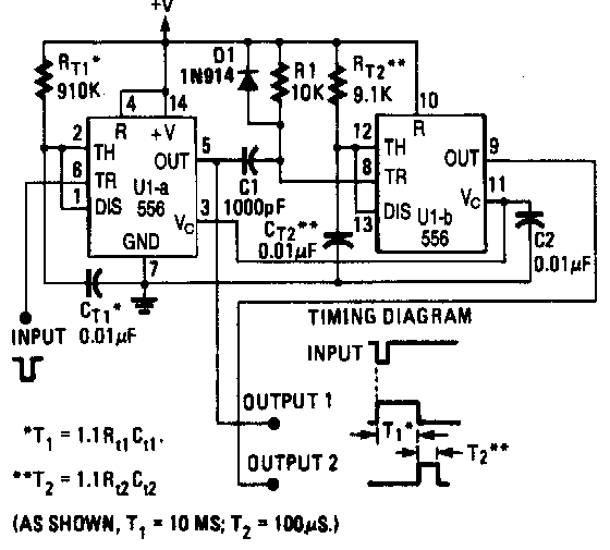 Encontramos este circuito numa Hands On Electronics dos anos 90. O retardo é dado pelas fórmulas junto ao diagrama.