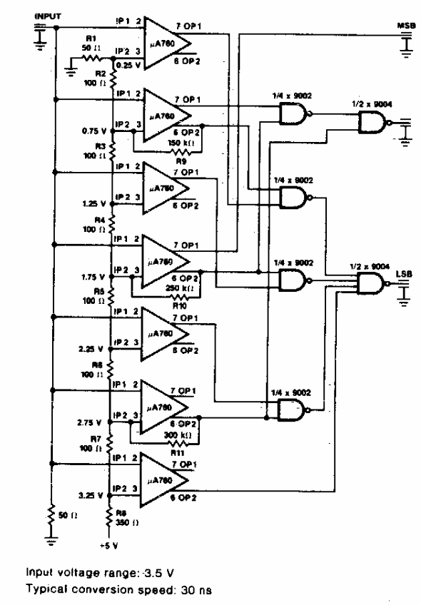Este conversor rápido usando operacionais foi encontrado numa documentação americana dos anos 70. O circuito pode ser implementado com componentes equivalentes.