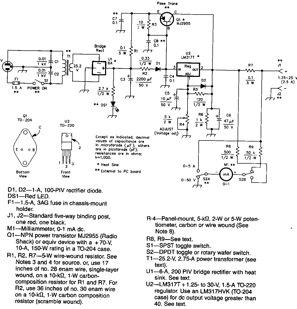 Esta fonte com 2,5 A foi encontrada numa revista QST dos anos 90. O transistor de potência deve ser montado em dissipador de calor.