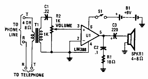 Encontrado numa Popular Electronics dos anos 90, este circuito pode empregar outros amplificadores de áudio de baixa potência. O transformador é do tipo encontrado na saída de velhos aparelhos transistorizados.