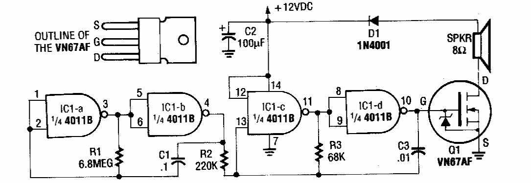 Esta sirene foi encontrada numa Radio Electronics antiga. O MOSFET admite equivalentes, devendo ser dotado de dissipador de calor. Alterações dos componentes podem ser feitas para modificar o som.