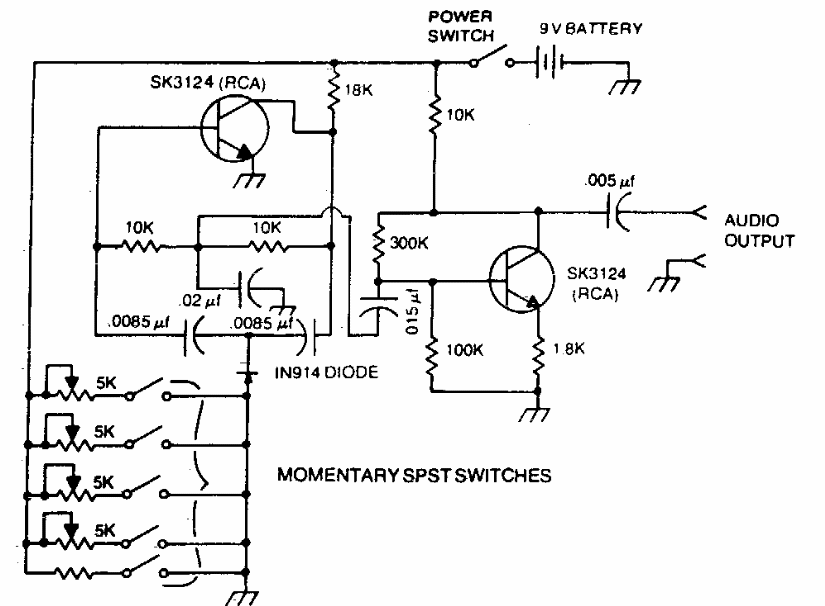 Este circuito foi encontrado numa documentação da RCA dos anos 70. Ele foi sugerido para se produzir tons para um codificador de controle remoto da época. O circuito gera tons senoidais de frequências ajustadas nos trimpots.
