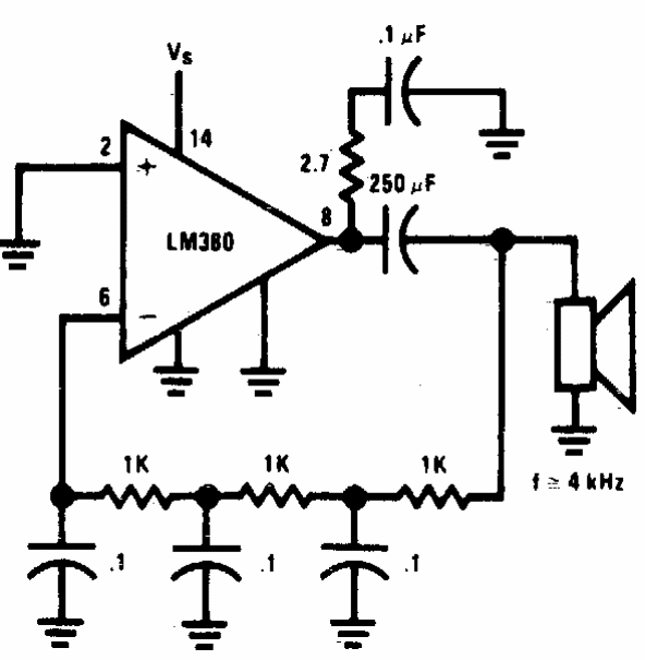 Com os componentes indicados, este circuito oscila em torno de 3,6 kHz. Os componentes podem ser alterados. O circuito é de uma documentação americana dos anos 70. Operacionais equivalentes podem ser testados. O operacional original é um amplificador de áudio.