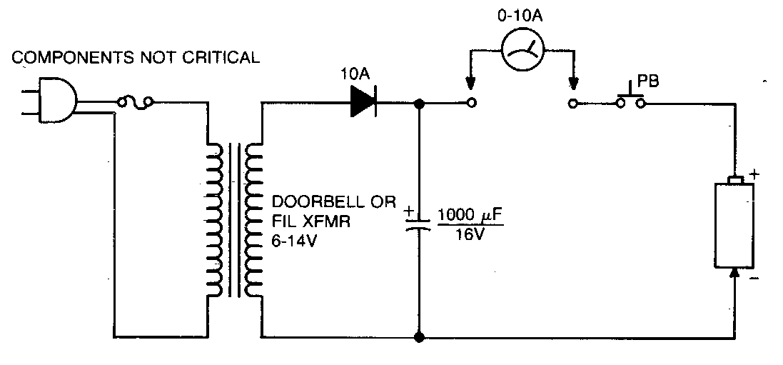 A finalidade deste circuito é produzir uma descarga rápida numa bateria em curto de modo a tentar sua recuperação. O diodo deve ser de alta corrente e o transformador também.