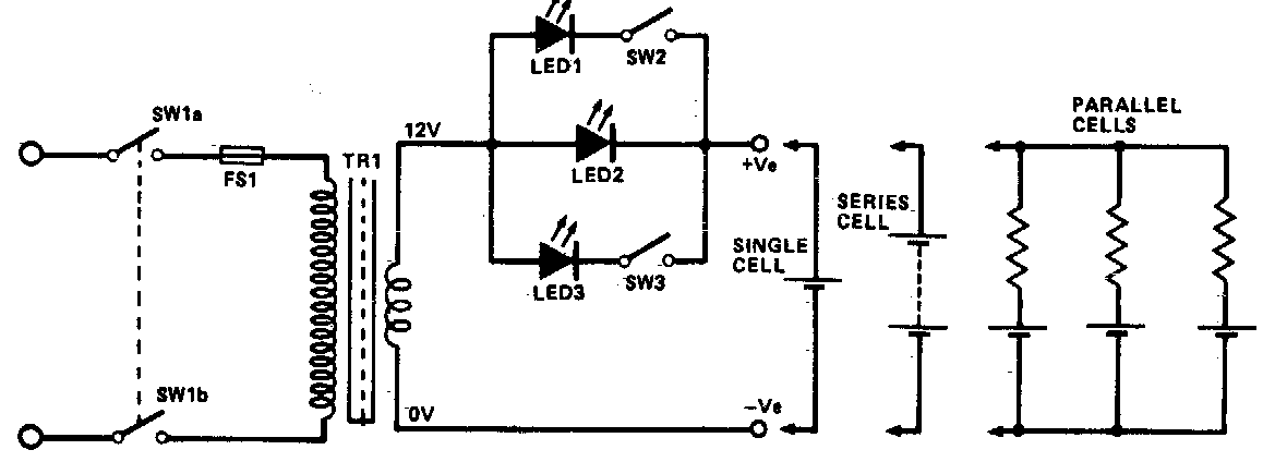 Neste carregador a corrente de carga é basicamente limitada pelos LEDs. O transformador é de baixa corrente, da ordem de 30 a 50 mA. As chaves selecionam as correntes de carga. Os resistores em série com as baterias determinam a corrente