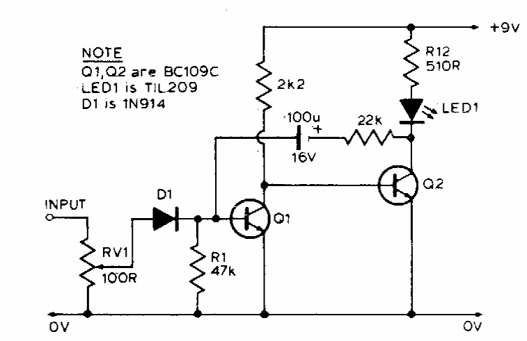Este circuito dispara um LED quando o pico de um sinal de entrada ultrapassa o valor ajustado em RV1. Os transistores podem ser os equivalentes modernos BC549.