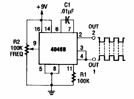 Encontrado numa Radio Electronics dos anos 90, este circuito gera sinais de 100 Hz a 1,5 kHz. O circuito integrado é CMOS podendo ser alimentado com tensões de 5 a 15 V.