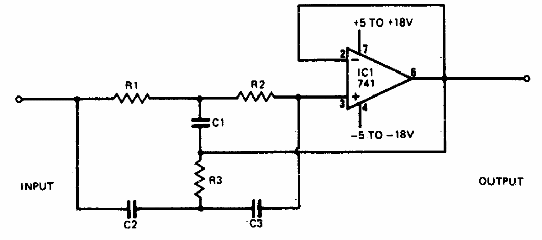 Esta configuração tradicional foi obtida numa documentação americana dos anos 80. Para capacitores de 320 pF e resistores de 100k a frequência é de 50 Hz.