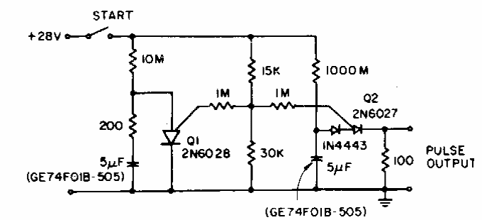 Este circuito foi encontrado em documentação da General Electric dos anos 90. O circuito faz uso de um transistor programável unijunção, que não é componente comum em nossos dias.