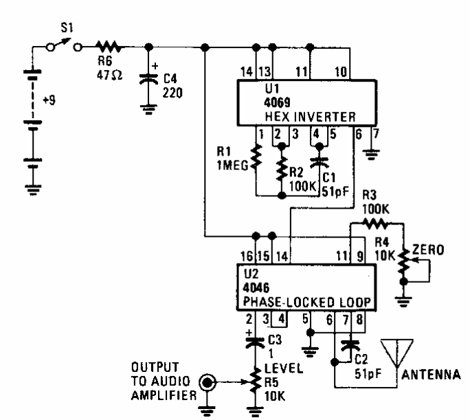 Encontramos este circuito numa Hands-On Electronics dos anos 90. O circuito deve ser ligado a um amplificador externo. O controle da frequência é capacitivo, utilizando-se uma antena para esta finalidade.
