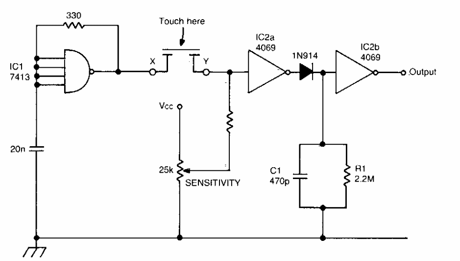Esta é uma das muitas configurações possíveis de chave de toque usando circuitos integrados CMOS. O circuito é de uma documentação americana dos anos 80. A fonte deve ser isolada.