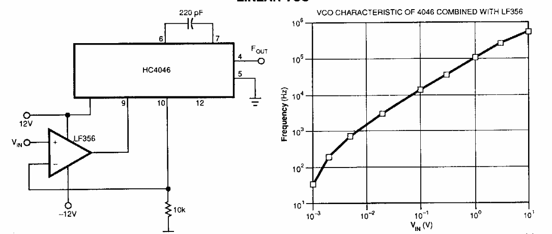 Encontrado em uma EDN dos anos 90, este circuito gera sinais na faixa de frequências dada pelo gráfico. O circuito exige uma fonte de alimentação simétrica.