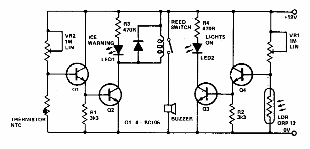 Encontrado numa documentação americana dos anos 90, este circuito que era usado em carros da época, detecta baixas temperatura e luz acionando um relé de aviso.