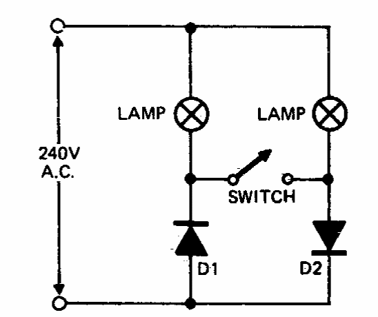 Este circuito, para lâmpadas incandescentes comuns, permite ajustar o nível de iluminação em 2 posições. O circuito se aplica à rede de 110 V também e os diodos devem ser de acordo com a potência das lâmpadas.